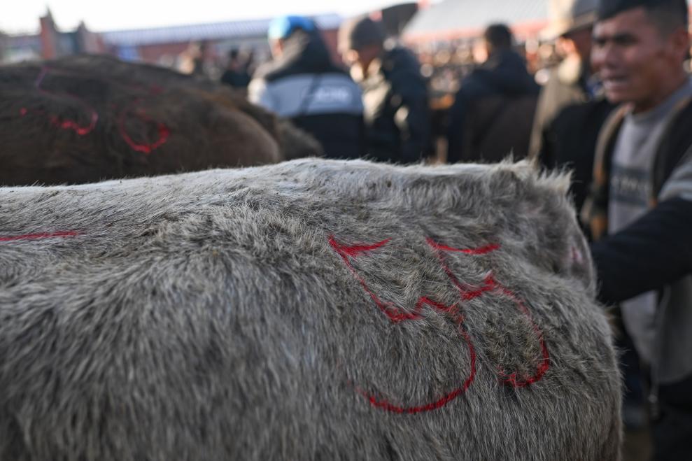 这是马军当日收购的第55头牛身上的标记(12月3日摄)。马军介绍,高峰期单日可收购100多头牛。新华社记者 胡虎虎 摄