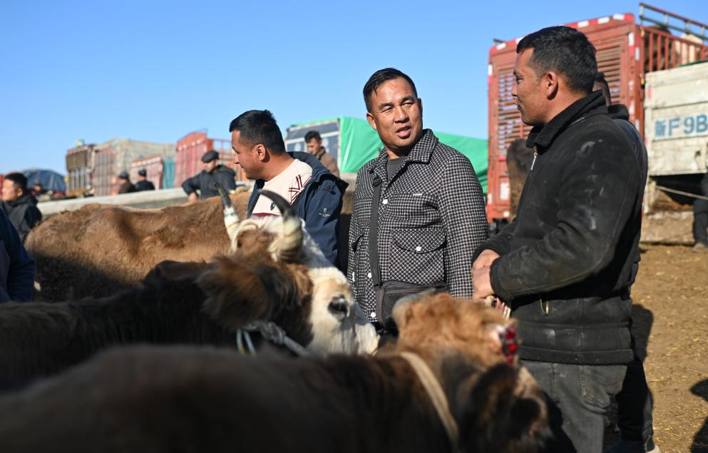 在新疆创锦黄公农产品交易市场,马军(右二)和售牛村民交流(12月1日摄)。新华社记者 胡虎虎 摄