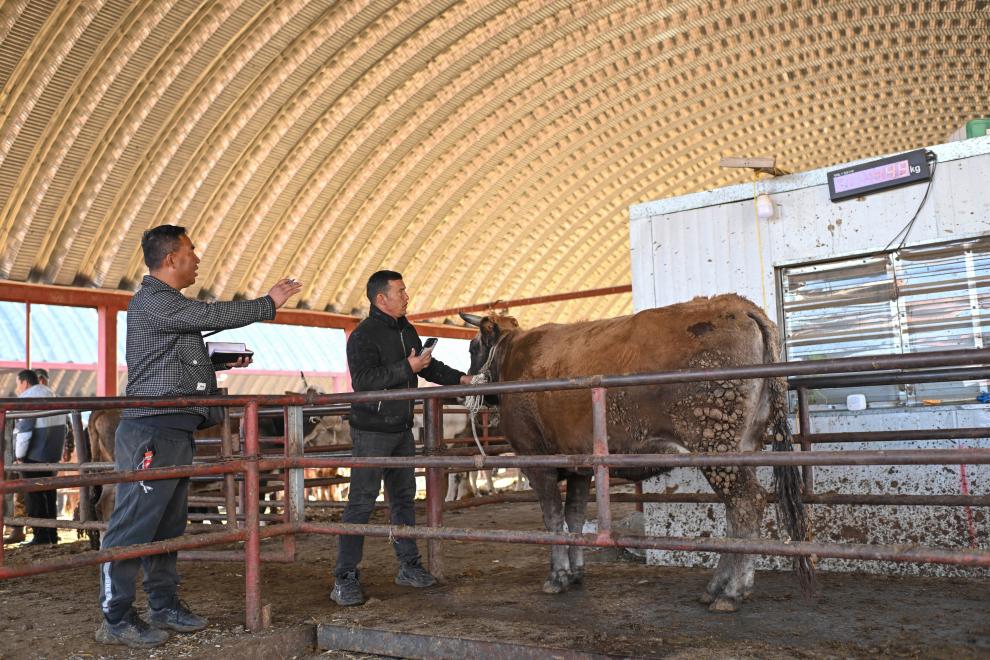 马军(前)在新疆创锦黄公农产品交易市场为客户选牛(12月3日摄)。新华社记者 胡虎虎 摄