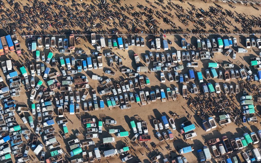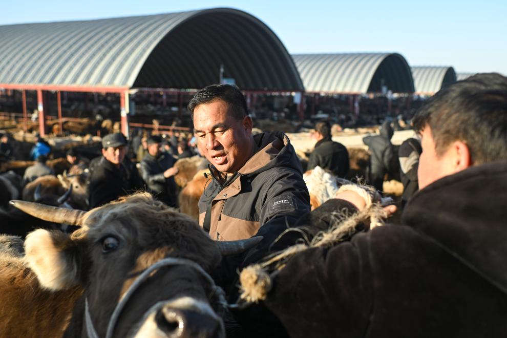 在新疆伊宁县的新疆创锦黄公农产品交易市场,牛羊成群围在栏中,牧民与牲畜经纪人大声商谈、击掌握手、买卖牲畜。这里又称“皇宫巴扎”,历史悠久,是新疆规模较大的活畜交易市场。目前,有超过3000名牲畜经纪人活跃于此,他们是连接牧场与市场的“纽带”——农牧民盼着以优价售卖牛羊等牲畜,但又难以直接接触到买家,不能准确把握市场行情;而各地的买家则希望高效、优惠地购入新疆高质量的牲畜。牲畜经纪人通过自己的经验和人脉,为农牧民与买家牵线搭桥,促成新疆优质畜牧产品销至全国,也助力繁荣乡村经济。