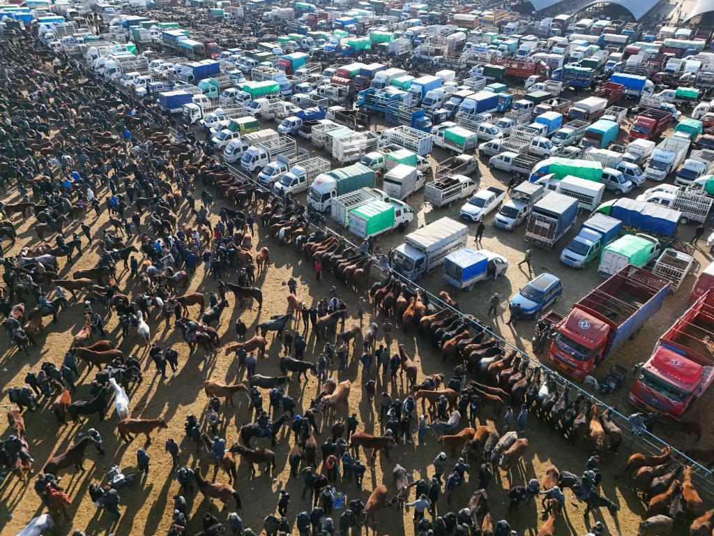 这是12月3日拍摄的新疆创锦黄公农产品交易市场的马匹交易区(无人机照片)。新华社记者 胡虎虎 摄