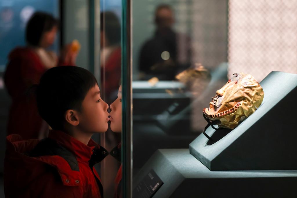 1月20日,观众在展览上观看公元4至5世纪的镶嵌红宝石金面具。新华社记者 王翔 摄