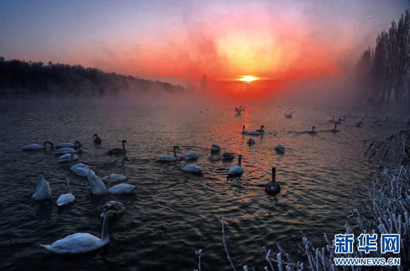 大寒以来,新疆伊宁县天鹅泉连续多日雾凇凝霜、雾气氤氲,远山皑皑白雪映着金色朝霞,成群疣鼻天鹅、大天鹅翩跹起舞,构成一幅梦幻般的冬日画卷。