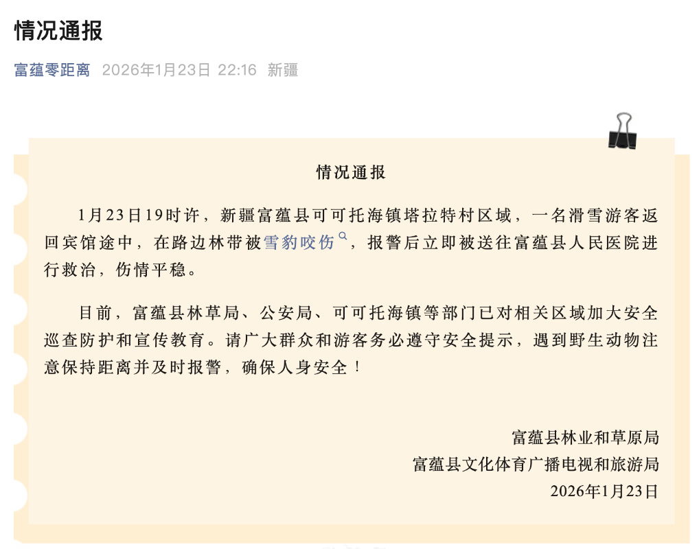 1月23日,在新疆富蕴县可可托海景区宝石沟附近,有游客拍到疑似雪豹袭人的视频。经当地派出所核实,有一名游客面部受伤,已转移到医院救治,目前没有生命危险。