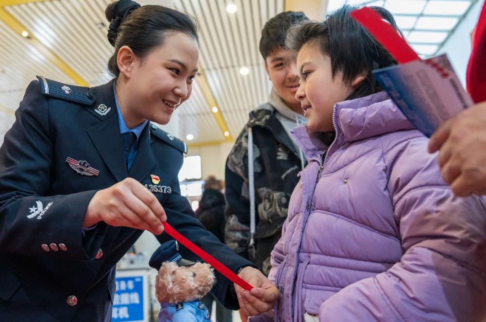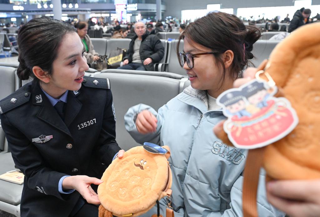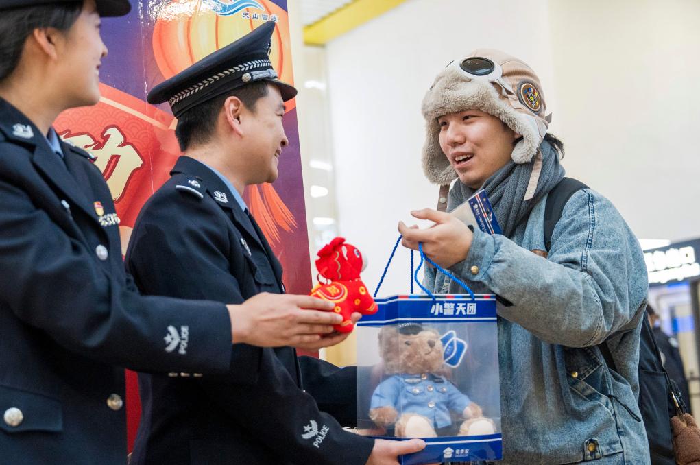 1月30日,在乌鲁木齐铁路公安处举办的“新疆铁警‘警馕’妙计 助您平安回家”安全出行宣传活动中,民警将内置有安全出行卡片的文创产品送给参与活动的旅客。