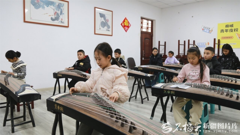 在阿瓦提县文化馆,孩子们学习弹奏古筝。包良廷摄