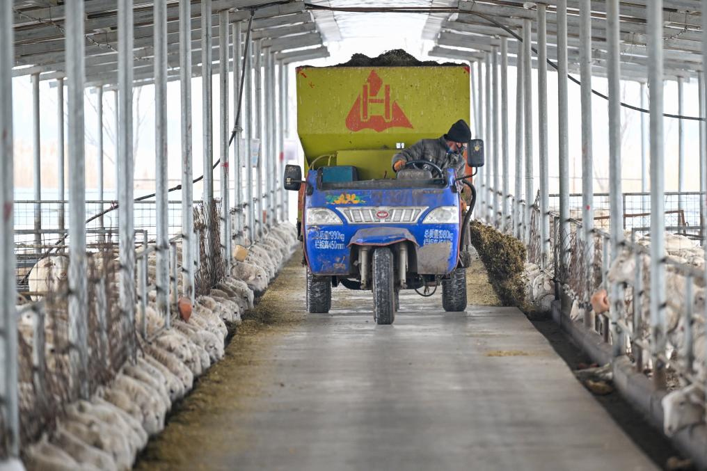 在位于新疆昌吉回族自治州的日发新西域玛纳斯牧业有限公司,工作人员驾驶自动撒料车喂羊(3月3日摄)。新华社记者 丁磊 摄