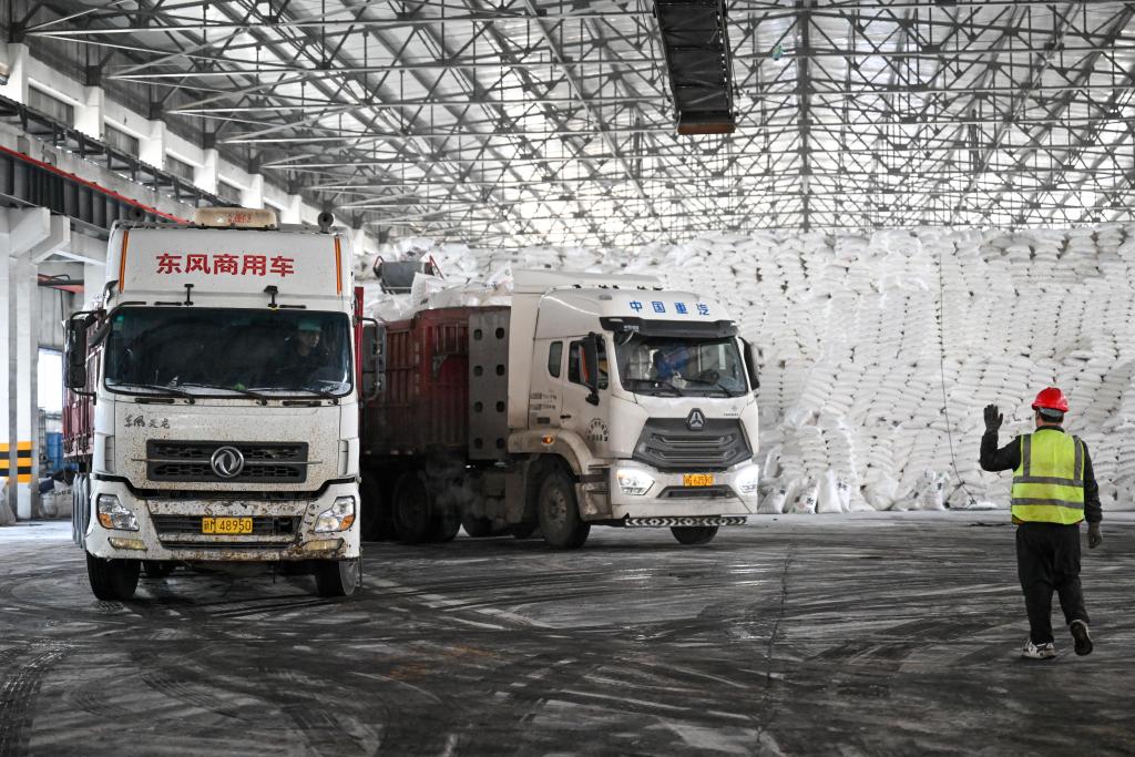 在位于新疆昌吉回族自治州玛纳斯县的新疆中能万源化工有限公司,货车等待装车作业(3月5日摄)。