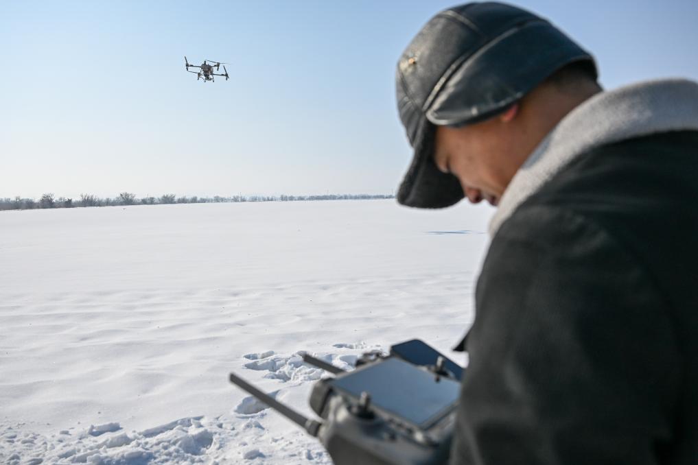 在新疆昌吉回族自治州玛纳斯县乐土驿镇,飞手操作无人机播撒返青肥料(3月4日摄)。