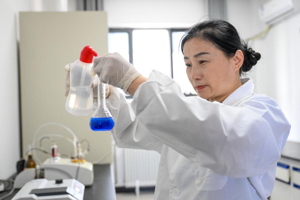 在位于新疆昌吉回族自治州玛纳斯县的新疆中能万源化工有限公司,工作人员在进行成品检验(3月5日摄)。
