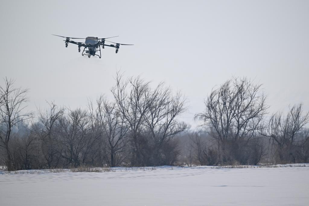 在新疆昌吉回族自治州玛纳斯县乐土驿镇,无人机在播撒返青肥料(3月4日摄)。