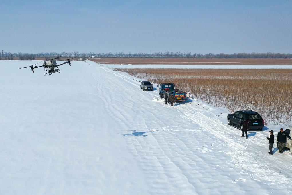 在新疆昌吉回族自治州玛纳斯县乐土驿镇,飞手操作无人机播撒返青肥料(3月4日摄,无人机照片)。