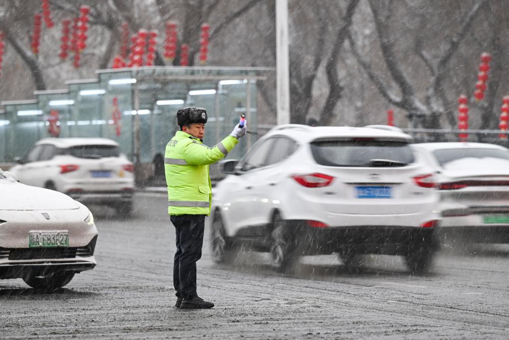3月11日,乌鲁木齐市公安局交通管理支队天山区大队民警在西大桥路口引导车辆通行。