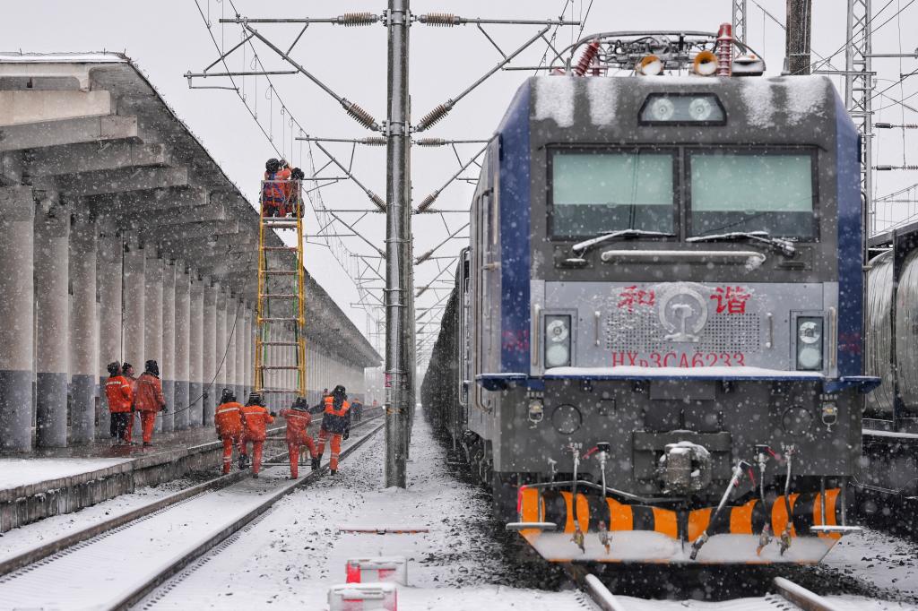 3月11日,在乌鲁木齐西站,乌鲁木齐供电段接触网工在雪中检修接触网。新华社发(摆风亮 摄)