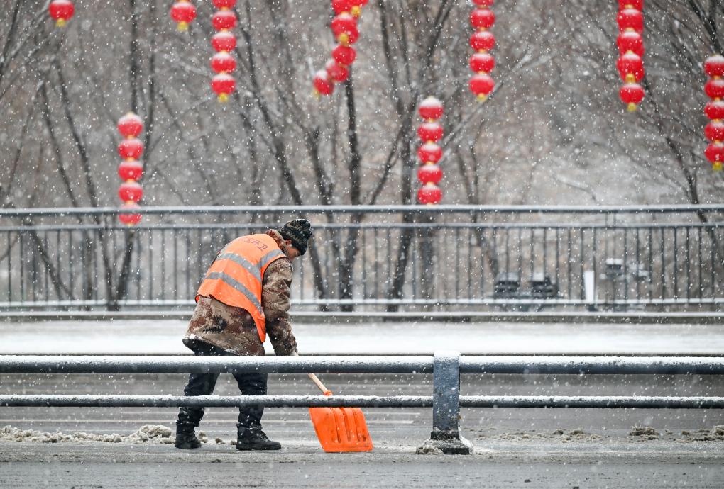 3月11日,环卫公司工作人员在新疆乌鲁木齐市西大桥附近清理积雪。新华社记者 王菲 摄