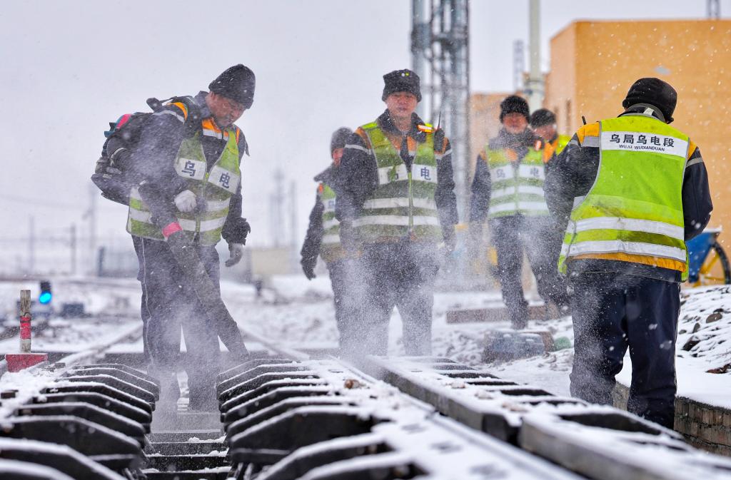 3月11日,在乌鲁木齐西站,乌鲁木齐电务段的职工进行清雪作业。新华社发(摆风亮 摄)