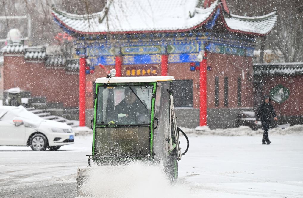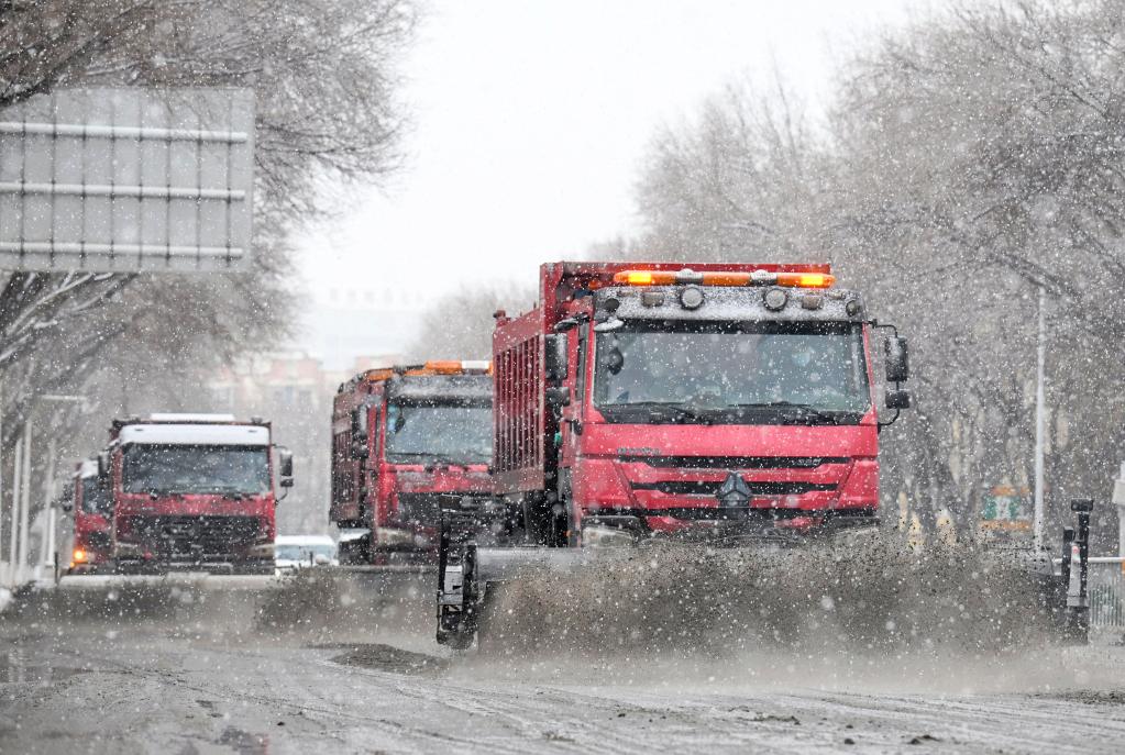 3月11日,清雪车辆在新疆昌吉市道路上除雪。新华社发(何龙 摄)