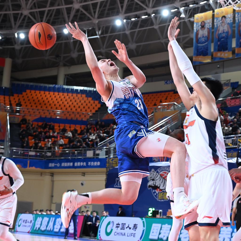 3月11日,新疆伊力特队球员阿不都沙拉木(左)在比赛中进攻。新华社发(徐锐摄)