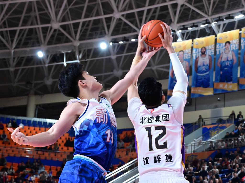 3月15日,北京控股队球员朱松玮(右)在比赛中与新疆伊力特队球员冯傲争抢篮板。新华社发(徐锐摄)