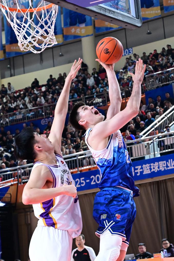 3月15日,新疆伊力特队球员葛浩然(右)在比赛中突破上篮。新华社发(徐锐摄)