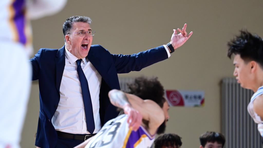 3月15日,新疆伊力特队主教练格兰(后)在场边指导球员。新华社发(徐锐摄)
