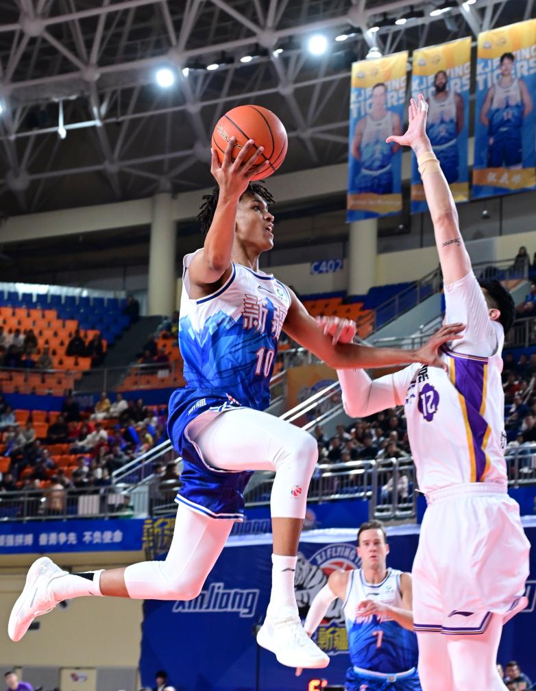 3月15日,新疆伊力特队球员阿不都沙拉木(右)在比赛中突破上篮。新华社发(徐锐摄)