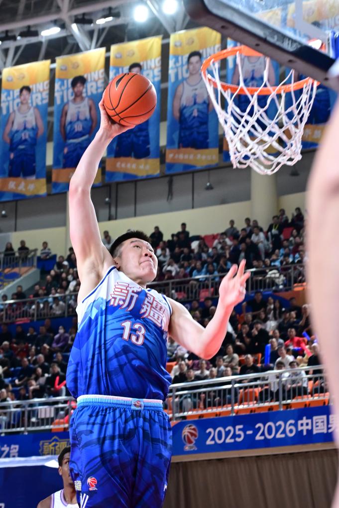 3月15日,新疆伊力特队球员李炎哲在比赛中扣篮得分。新华社发(徐锐摄)